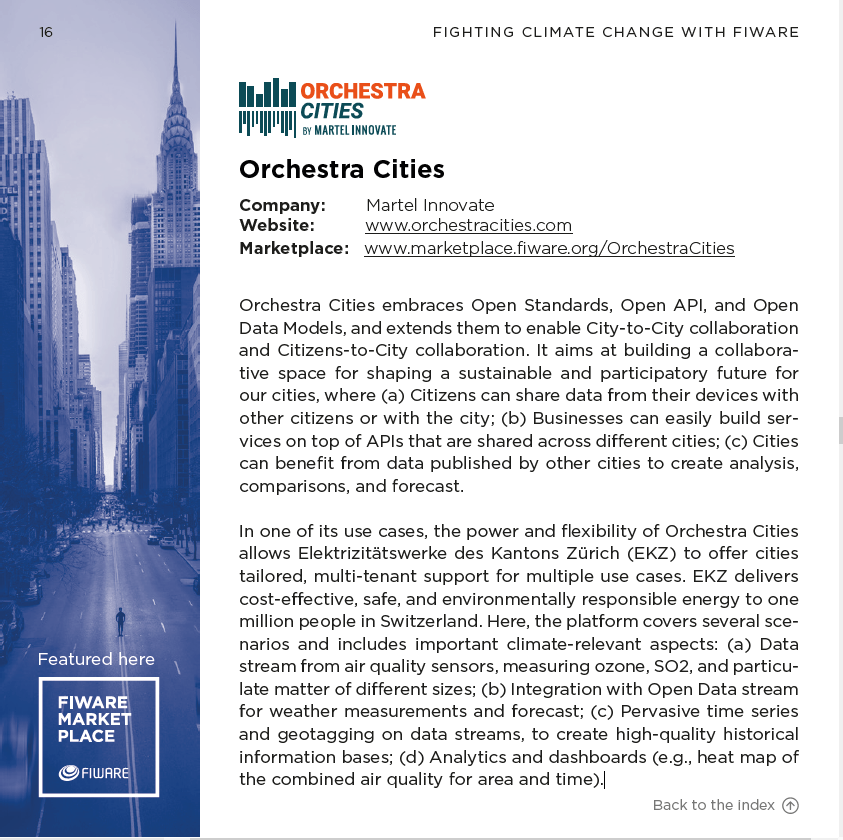 Martel’s smart city platform Orchestra Cities is featured as a key project in the ‘Fight against climate change‘ booklet by the FIWARE Foundation.